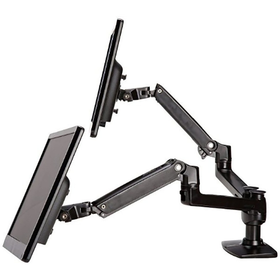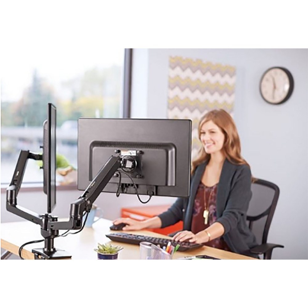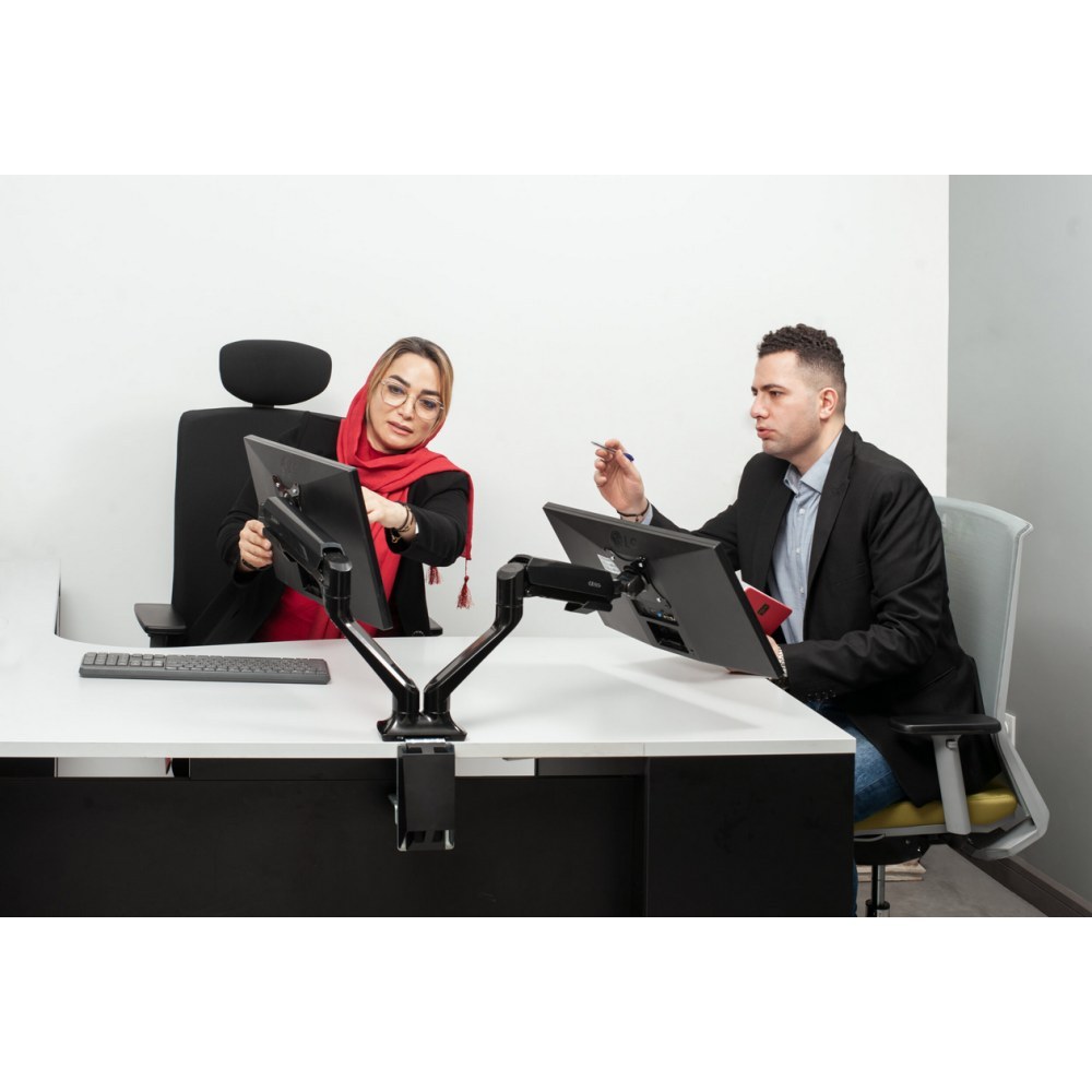 قابلیت استفاده همزمان از دو مانیتور و تغییر موقعیت آنها نسبت به هم,قابلیت تغییر موقعیت قرارگیری مانیتور ها متناسب با نیازهای ارگونومیک کاربر,طراحی ارگونومیک که منجر به افزایش بهره وری و کارایی میشود,تثبیت موقعیت قرارگیری مانیتورها بدون رانش و افتادگی,قوی و محکم با پایداری بالا,مدیریت کابل ها با استفاده از فضای تعبیه شده داخل هولدر که میز کار خلوت و مرتبی را فراهم خواهد اورد.